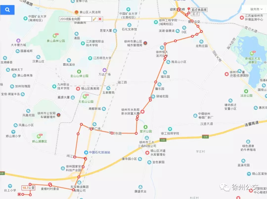 為滿足廣大市民出行需求,進(jìn)一步擴(kuò)大徐州高新區(qū)和市區(qū)的交通線網(wǎng),促進(jìn)區(qū)域交通和諧發(fā)展,為更多的市民提供便捷的城市客運(yùn)服務(wù),徐州公交開通了205路線,并于12月18日上午8:30分開始試運(yùn)行。具體線路走向及??空军c(diǎn)如下: