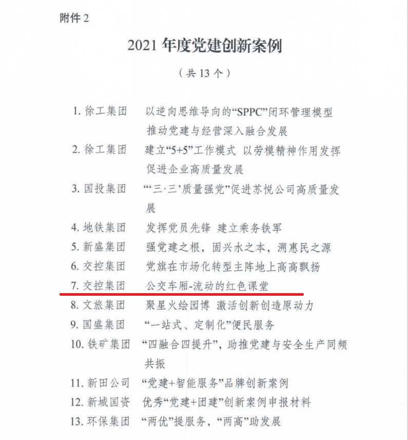 同時(shí),市國資委黨委通報(bào)了2021 年度十佳黨建品牌和優(yōu)秀"黨建+"創(chuàng)新案例評選表彰結(jié)果,徐州公交《公交車廂-流動的紅色課堂》獲評2021年度黨建創(chuàng)新案例。
