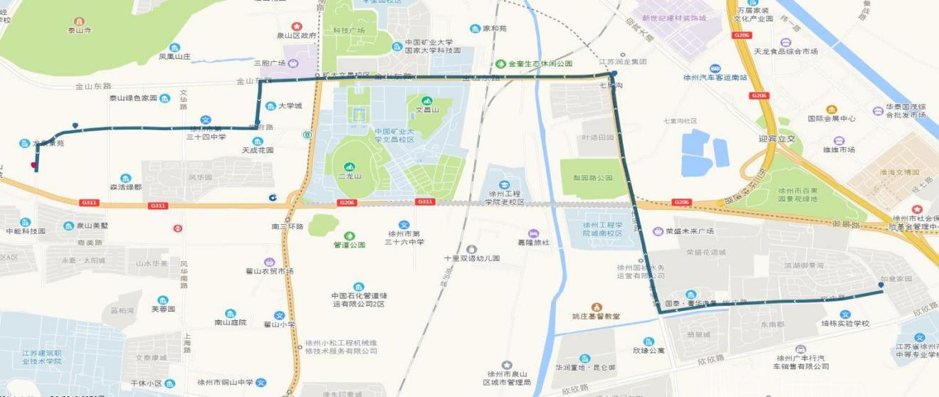 線路站點:建筑學院、江蘇師范大學、師范大學地鐵站、萬科新都會、港鑫城、南洋國際、康樂園南門、無名山公園地鐵站、銅山區(qū)政府、楚河金茂府、嵩山路、銅山新區(qū)總站、久隆鳳凰城北門、保利迎賓館、龍腰山公園、泉山森林海、第一人民醫(yī)院南門。