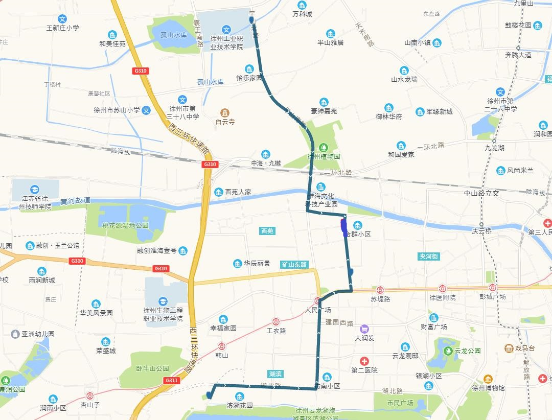 線路站點:御景灣公交首末站、濱湖御景灣南門、姚莊街坊中心、欣欣路口、七里溝地鐵站、礦大北門、大學城、天成花園、三十四中、三十中附小、泉泰嘉苑、泉山美墅西門(路西,單向)、碧水灣小區(qū)(路北、單向)、泉山法院(路南,單向)。備注:因目前雙山路與三環(huán)南路交叉口正在施工,公交車輛無法通行,319路暫時僅運行至泉泰嘉苑。待道路貫通后,進行全線路運營。