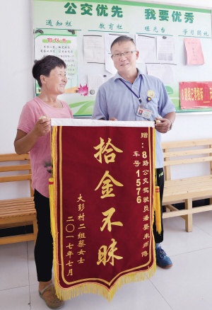 7月21日《都市晨報(bào)》A08版刊登了《急匆匆出門見朋友 3000多元現(xiàn)金遺失公交上》一文,講述了8路駕駛員潘要來(lái)拾金不昧的事跡。7月19日下午,家住銅山區(qū)大彭鎮(zhèn)的蔡女士從大彭鎮(zhèn)乘坐8路車到宣武,慌忙下車后,蔡女士忽然發(fā)現(xiàn)裝3000多元錢的布包不見了。兩人回憶,當(dāng)時(shí)忙著抱孩子了,把包遺失在了公交車上。蔡女士連忙回去,找到另外一名8路車駕駛員幫她聯(lián)系了8路調(diào)度室,很快傳來(lái)好消息:包找到了。原來(lái),蔡女士乘坐的8路車駕駛員潘要來(lái)看到了座位上有一個(gè)東西,當(dāng)時(shí)他誤認(rèn)為是坐墊,后來(lái),他看到有個(gè)乘客直接奔向那個(gè)座位,一屁股坐了下來(lái),神色有些慌張。潘師傅從后視鏡看到,那個(gè)東西鼓鼓囊囊不像坐墊,便走了過去,將包拿回駕駛室。