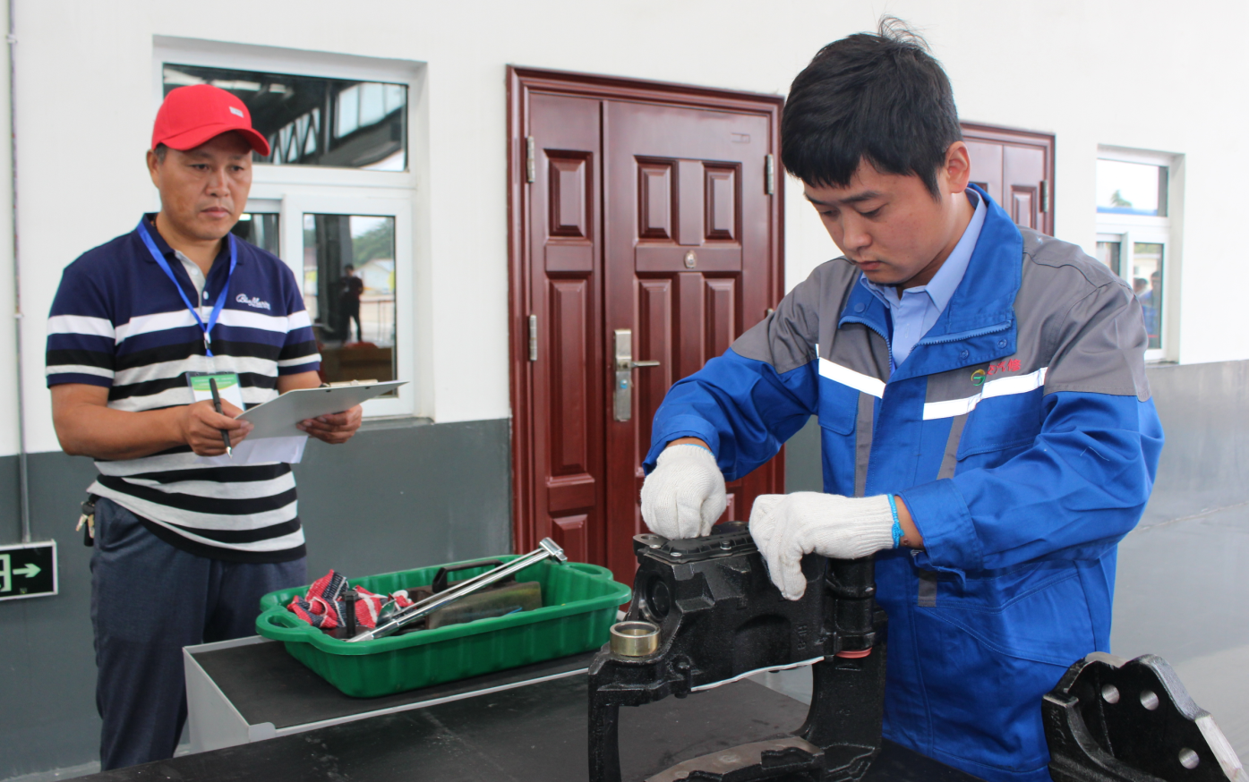 比賽開(kāi)始了!參賽選手們穿戴整齊的工作服,個(gè)個(gè)卯足了勁,整裝待發(fā)。整潔的維修車間兩個(gè)工作臺(tái)上,四組修理人員同時(shí)進(jìn)行盤式制動(dòng)器拆裝組合的項(xiàng)目比賽,四名裁判員認(rèn)真對(duì)照標(biāo)準(zhǔn)計(jì)分,現(xiàn)場(chǎng)安靜得只聽(tīng)見(jiàn)制動(dòng)器拆裝時(shí)輕微的“啪啪”聲。一旁的4個(gè)檢修地溝上,分別停著4輛新能源純電動(dòng)公交車,同時(shí)進(jìn)行著新能源車電控故障排除項(xiàng)目的比賽。參賽人員時(shí)而在駕駛室時(shí)而在車廂尾部檢修電路,裁判員根據(jù)實(shí)際操作隨機(jī)提問(wèn)、記錄。