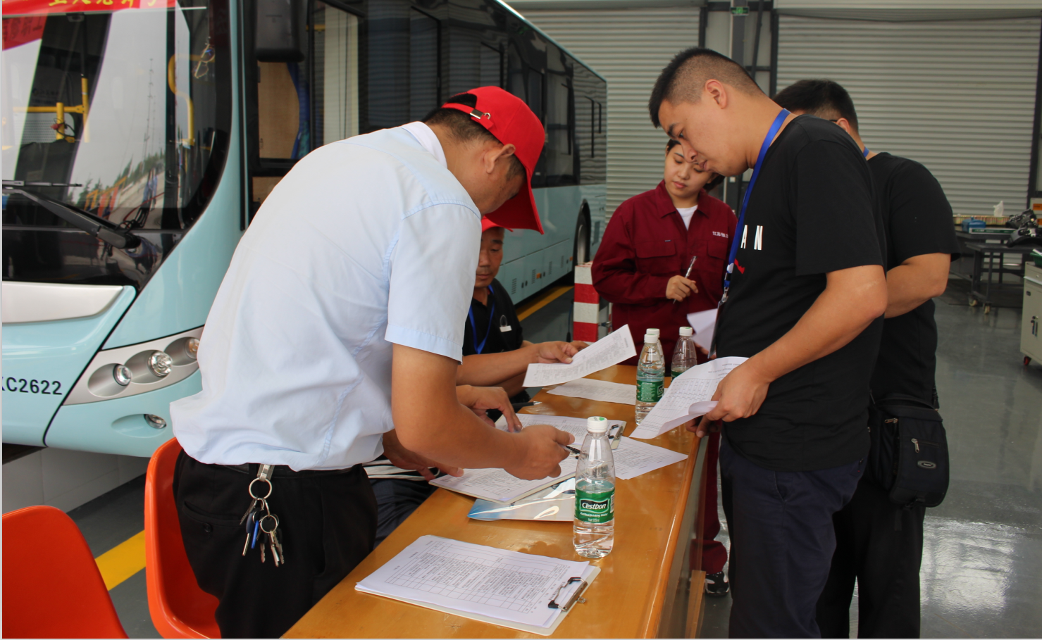 為充分展現(xiàn)公交駕駛員及修理工的技術(shù)水平,比賽項(xiàng)目的設(shè)置緊密結(jié)合兩工種的工作實(shí)際,其中,駕駛員實(shí)操比賽共設(shè):起始點(diǎn)發(fā)車、道路駕駛、限速限寬門、起伏路、站點(diǎn)停車、連續(xù)障礙、S彎道通過(guò)、單邊橋、靶心定點(diǎn)平穩(wěn)停車、平穩(wěn)駕駛等10個(gè)項(xiàng)目,維修實(shí)操比賽包括盤式制動(dòng)器拆裝組合、新能源電控故障排除、新能源空調(diào)故障排除等3個(gè)項(xiàng)目。